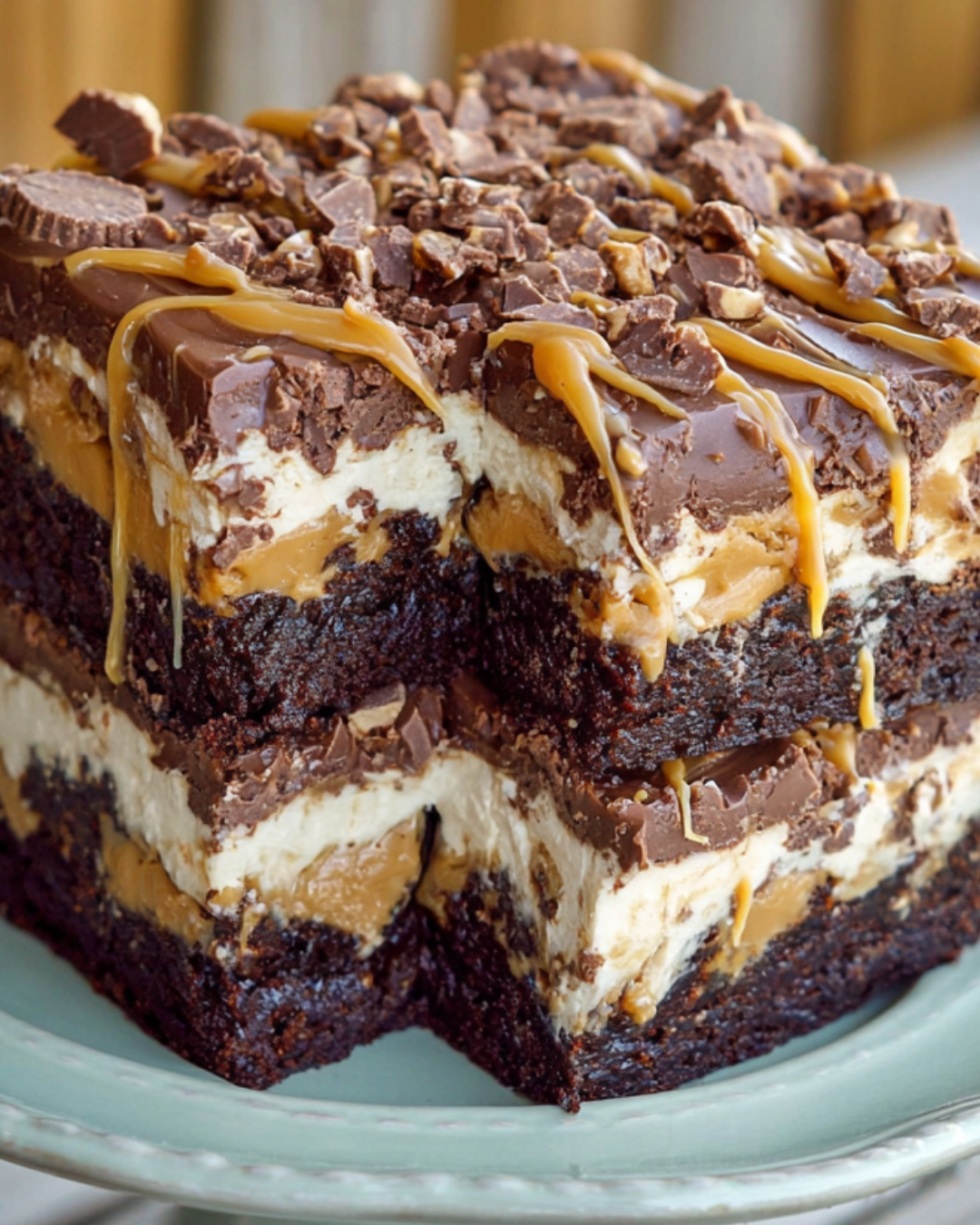 PrintReese’s Peanut Butter Brownie Cake: Indulge in Heaven!