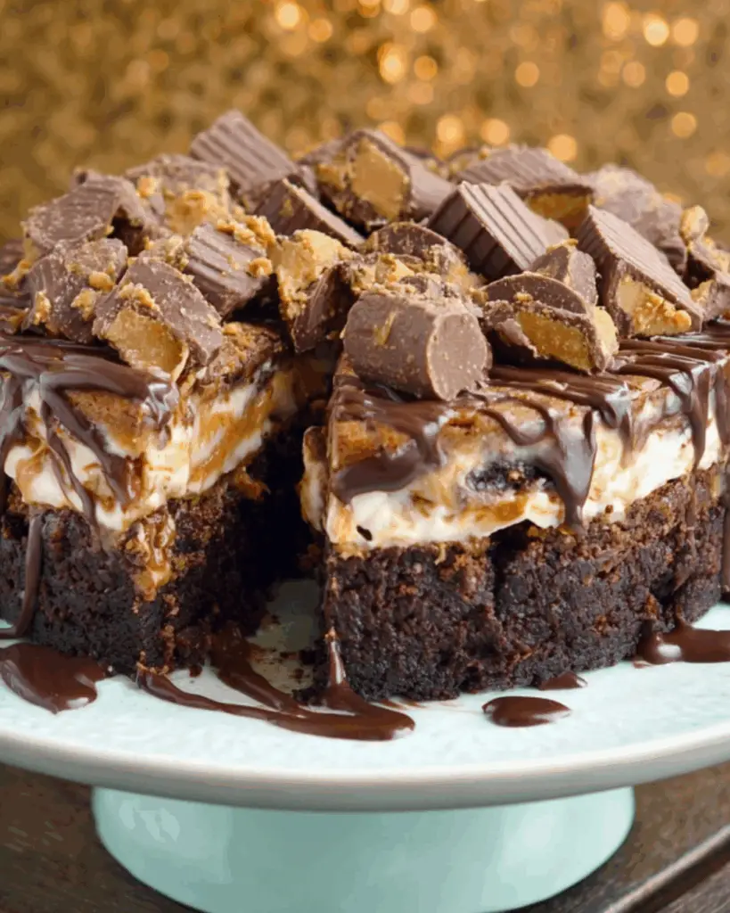 Indulge in the rich and decadent Reese’s Peanut Butter Brownie Cake, a perfect treat for chocolate and peanut butter lovers.