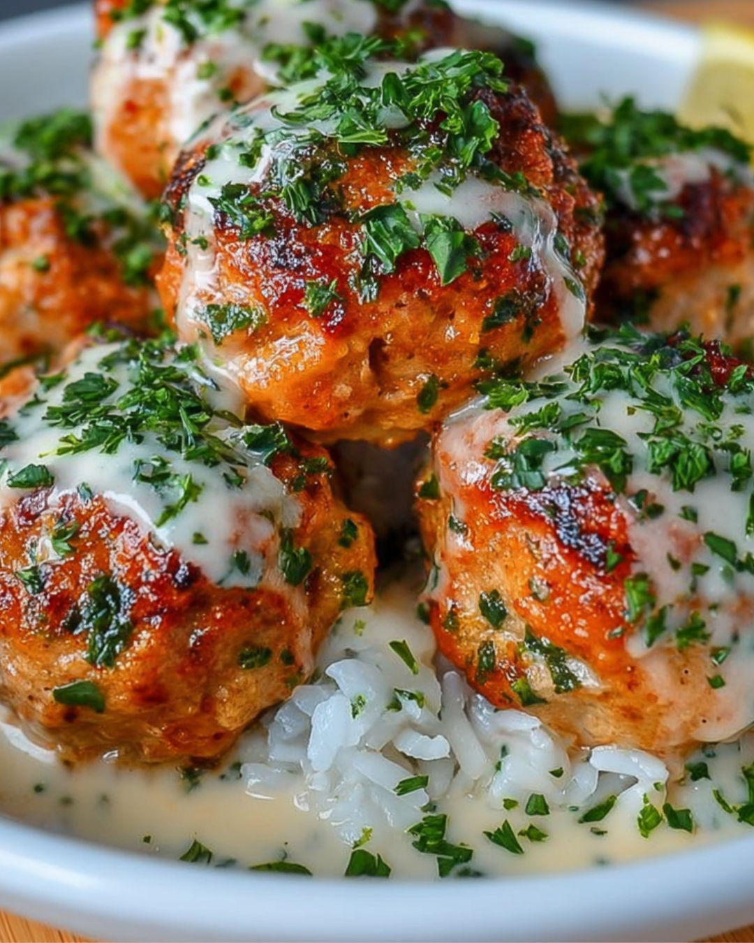 Delicious salmon meatballs served with a creamy garlic sauce, perfect for a healthy meal.