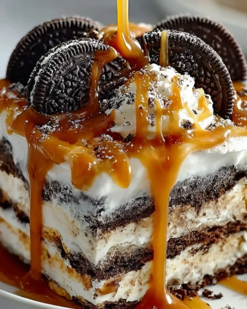 A decadent dessert featuring layers of Oreo cookies and a creamy salted caramel filling, perfect for any occasion.