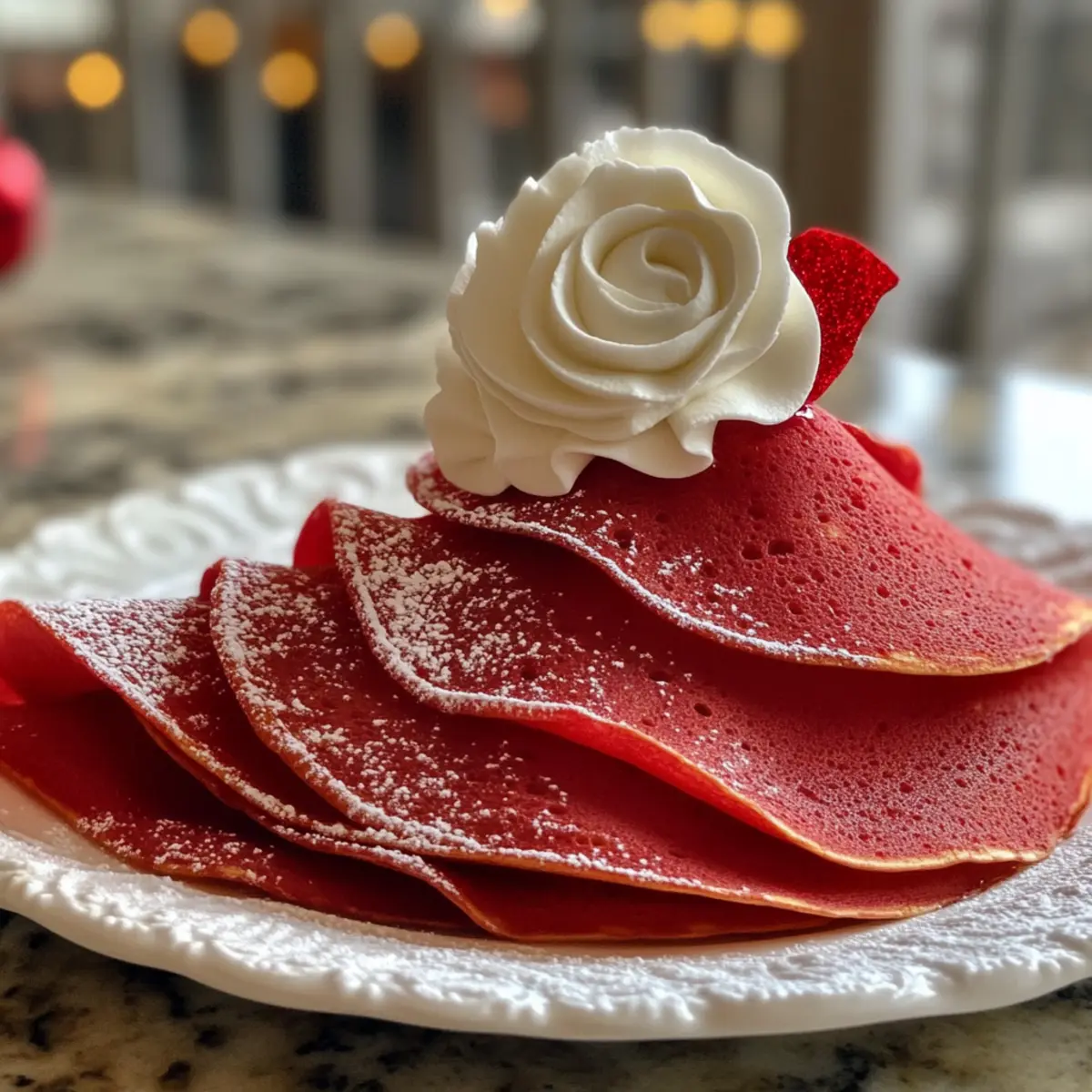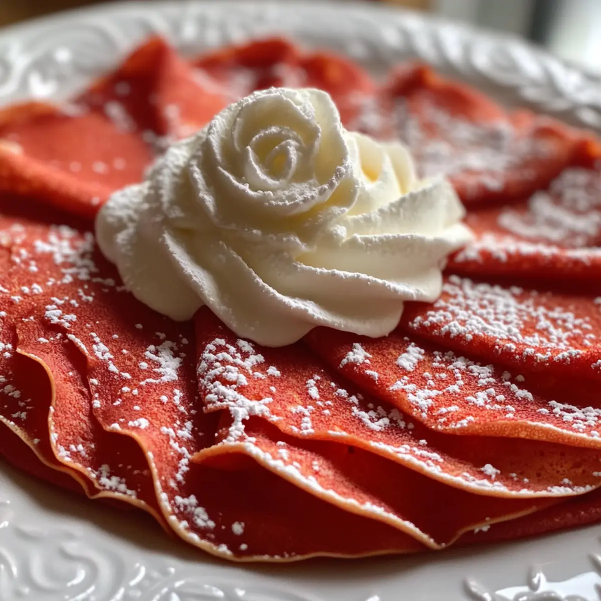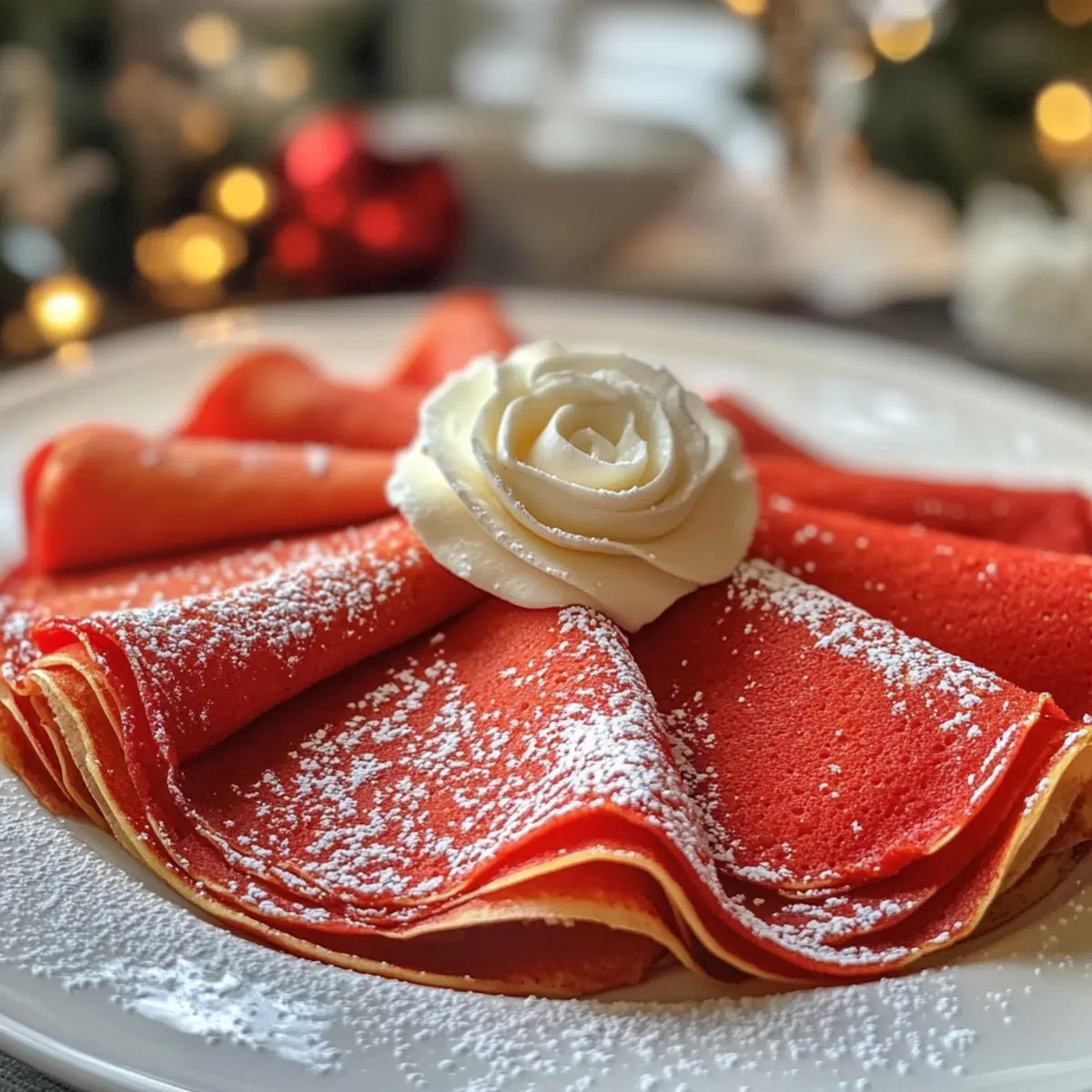Festive Presentation: The vibrant red crepes topped with fluffy whipped cream create a stunning centerpiece for your holiday table, making each bite both a treat for the eyes and the palate.