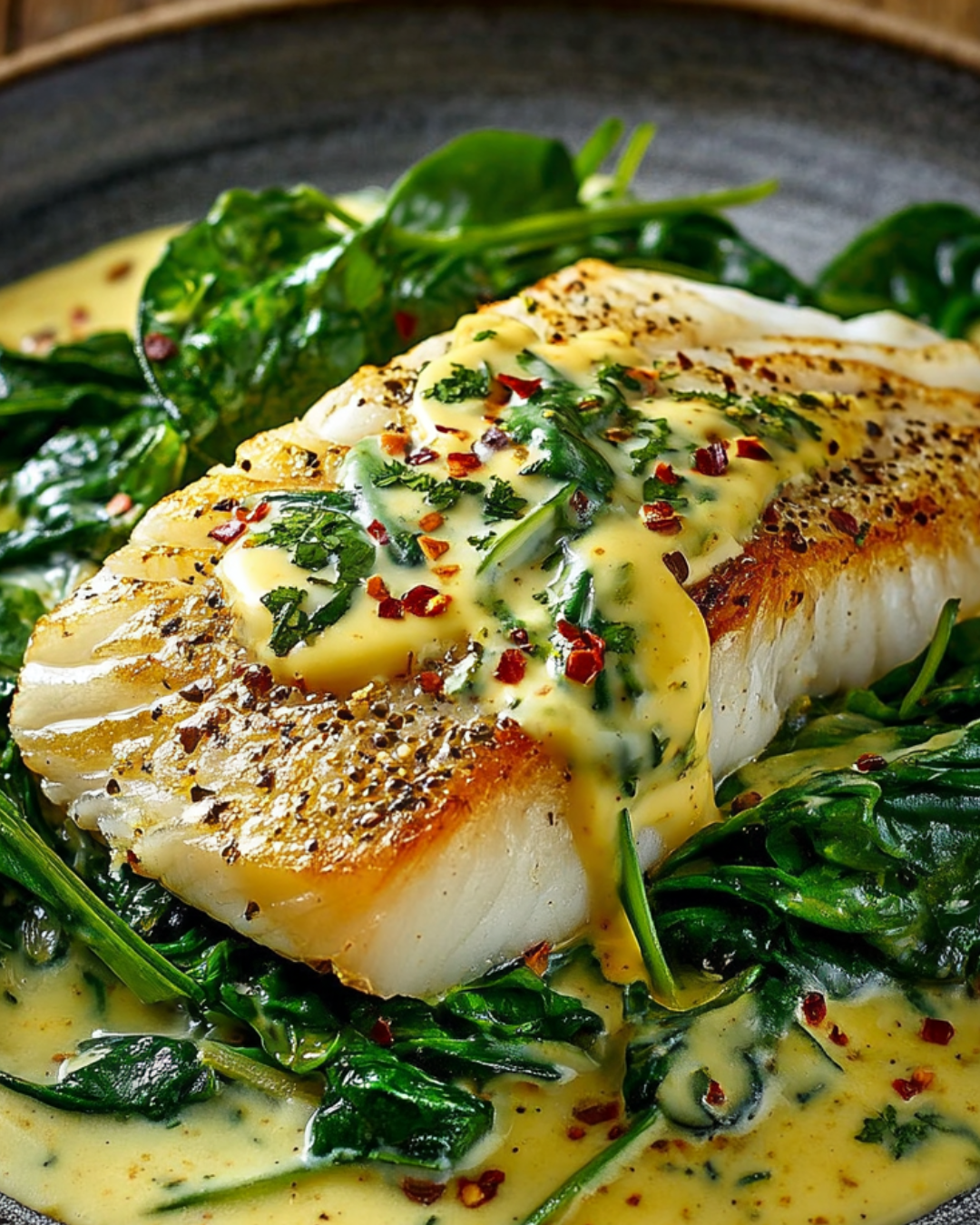 - To serve, place a portion of the sautéed spinach on each plate, top with the smoked haddock, and drizzle the mustard sauce over the fish. Garnish with chopped parsley.