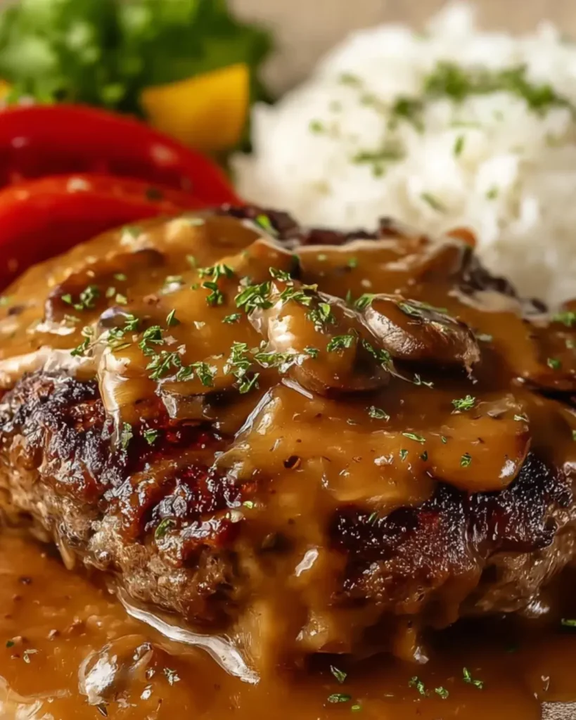A delicious and hearty recipe for smothered hamburger steak, featuring juicy beef patties topped with a rich mushroom and onion gravy.