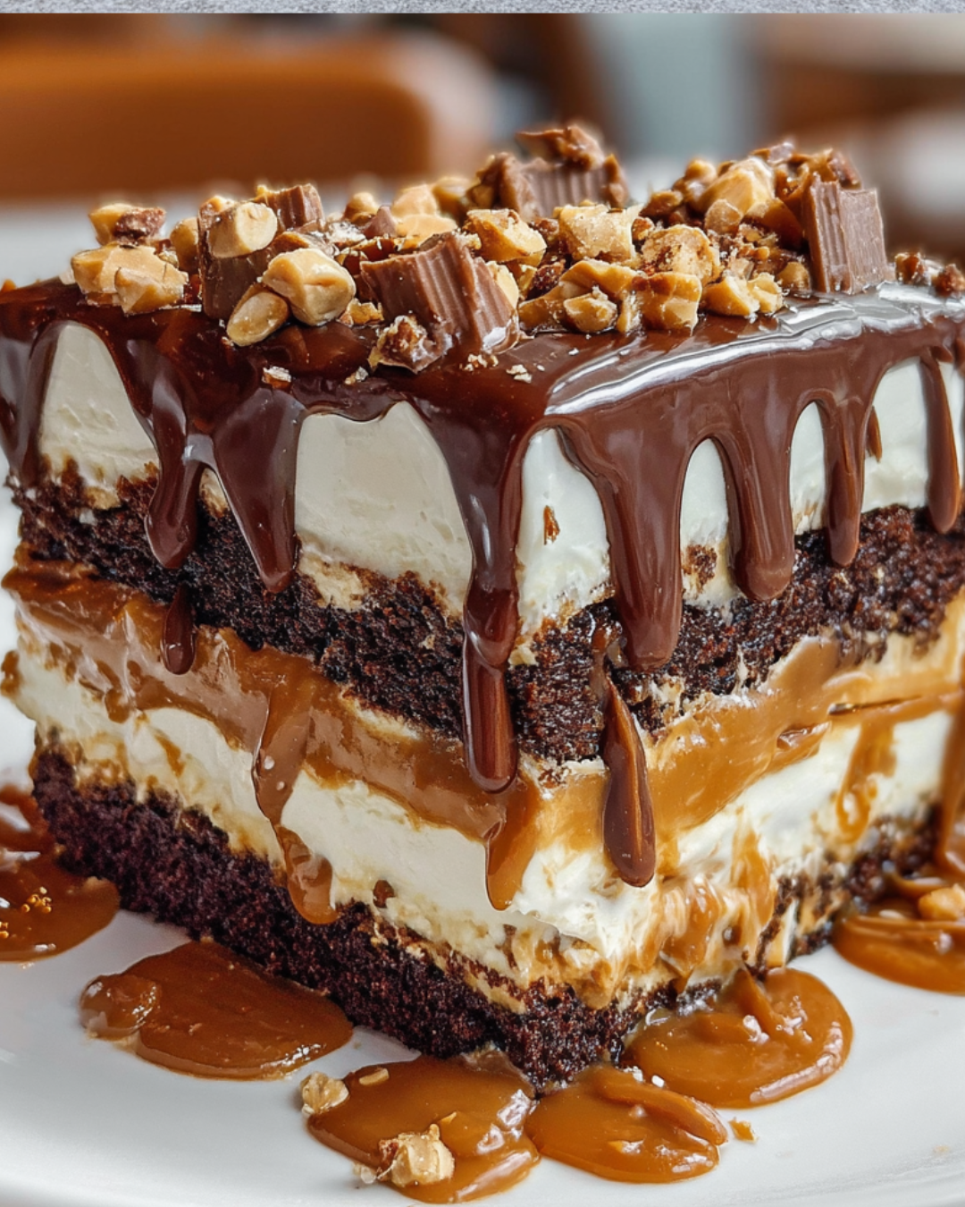 Snickers Cake is an indulgent dessert that combines rich chocolate cake with creamy peanut butter and Snickers bars, topped with chocolate frosting.