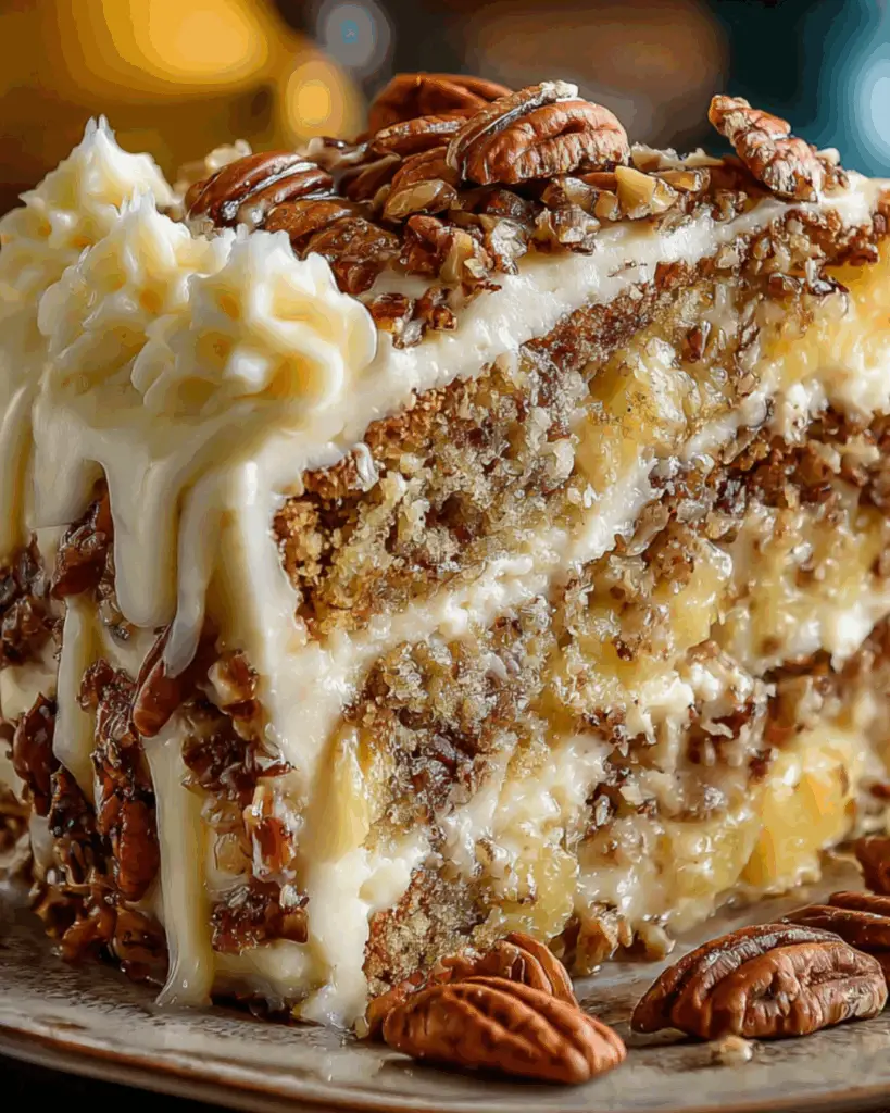 A delightful Southern Creamy Pineapple Pecan Cake that combines the sweetness of pineapple with the crunch of pecans, topped with a rich cream cheese frosting.