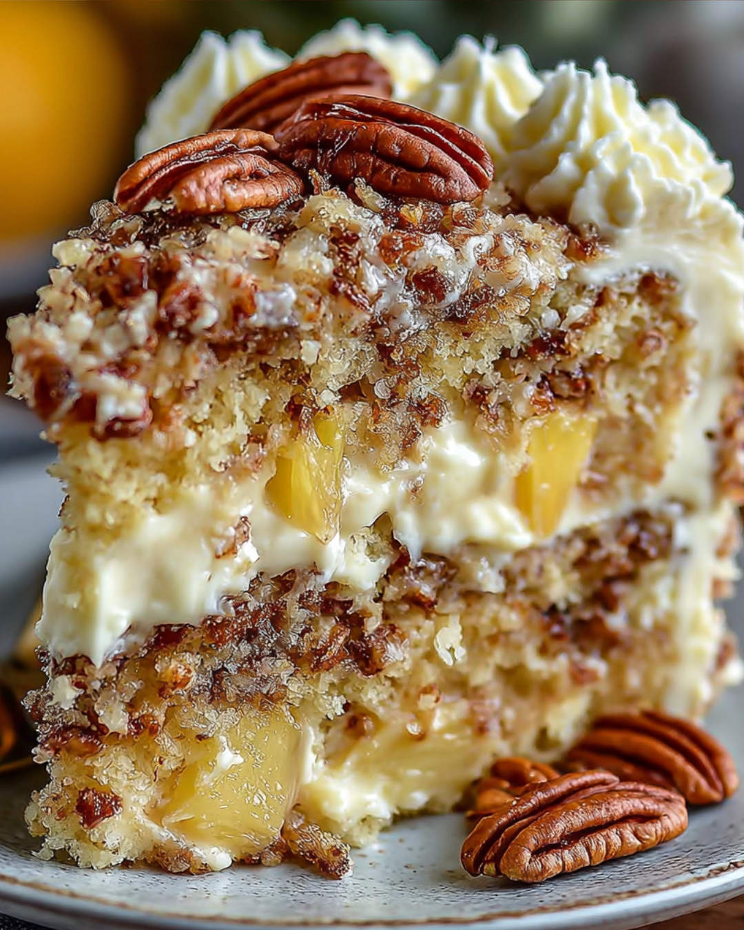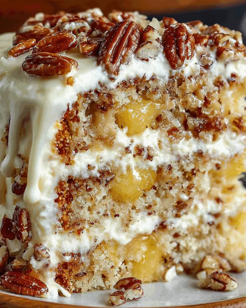 A delightful Southern Creamy Pineapple Pecan Cake that combines the sweetness of pineapple with the crunch of pecans, topped with a creamy frosting.