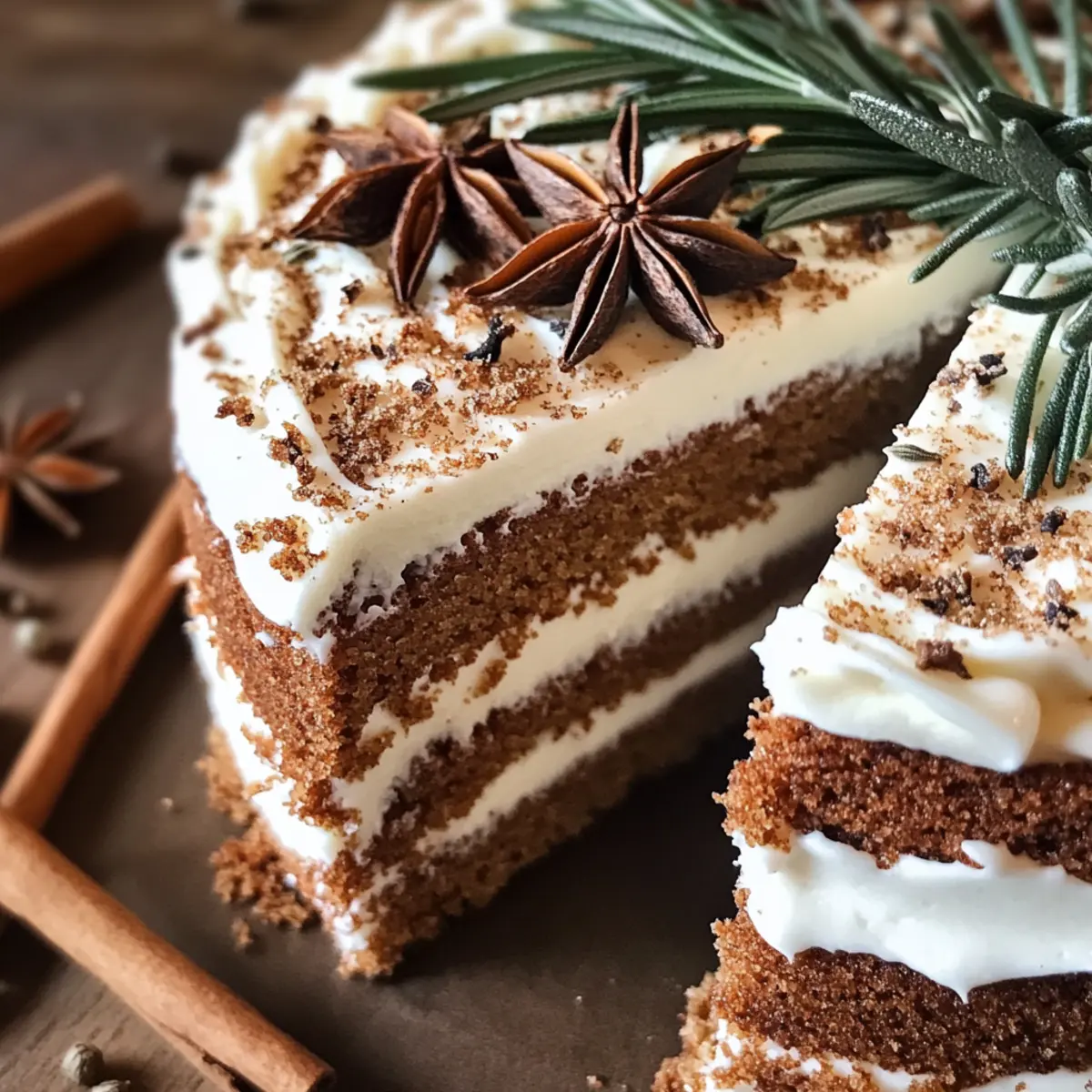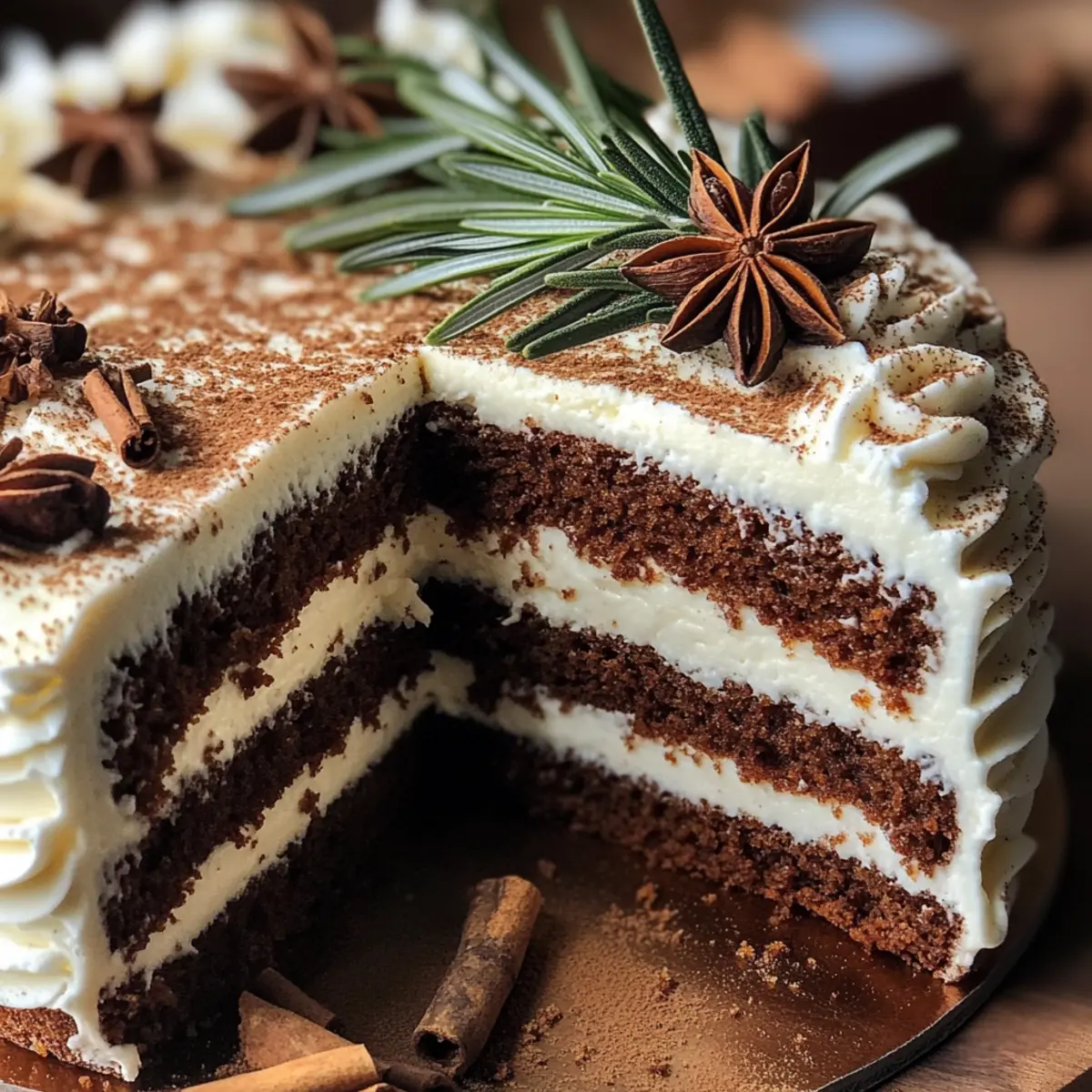 Preparing the Spiced Gingerbread Wreath Cake in advance is a fantastic way to save time during the busy holiday season! You can bake the cake up to 3 days ahead of time, letting it cool completely before wrapping it in plastic wrap and refrigerating. This keeps it moist and preserves its festive flavor. For the best results, frost the cake with whipped cream on the day you plan to serve it. Just whip the cream and spread it over the chilled cake, adding decorative rosemary sprigs, star anise, and cinnamon sticks for that special touch. With this make-ahead option, you’ll enjoy a gorgeous dessert while enjoying the festivities without any last-minute stress!