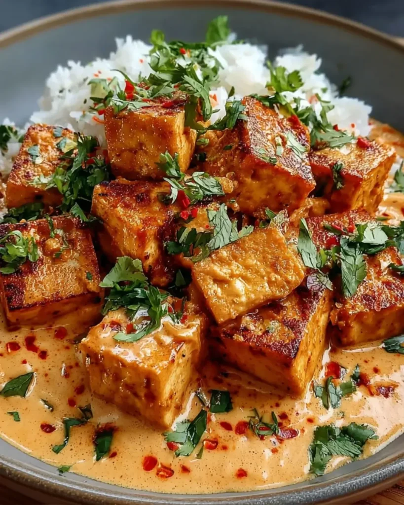 A flavorful dish featuring crispy tofu coated in a creamy coconut sauce with a spicy kick.