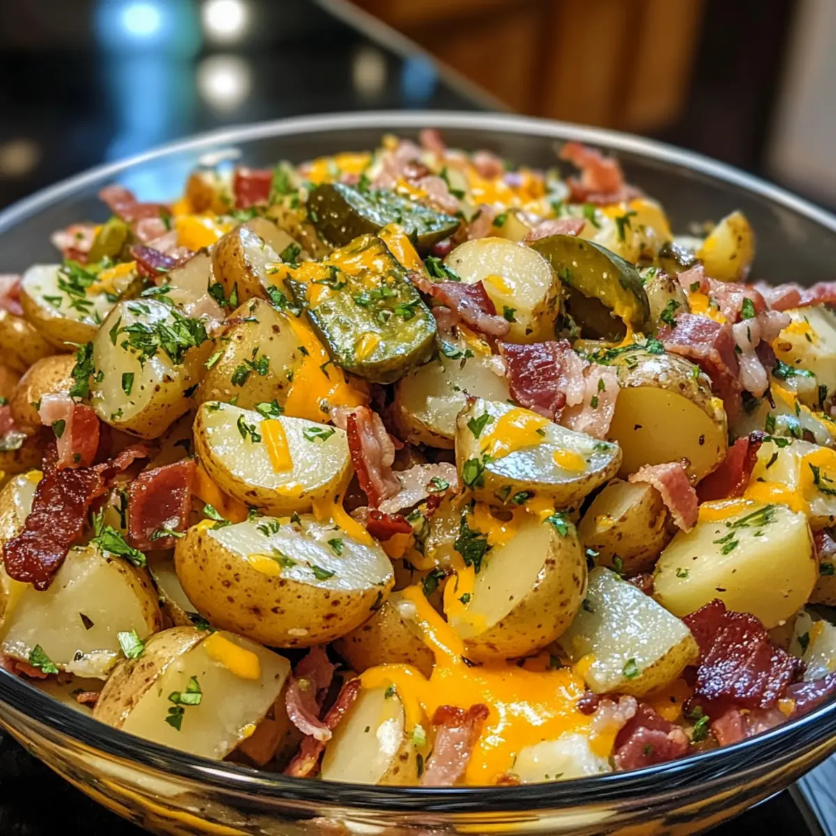 In a large serving bowl, combine the diced potatoes, 6 slices of crispy cooked bacon (crumbled), 1 cup of sharp cheddar cheese (shredded), and 1 cup of diced dill pickles. Gently fold the ingredients together, ensuring that the potatoes remain intact while blending in the savory bacon and cheese for a delightful balance of textures.