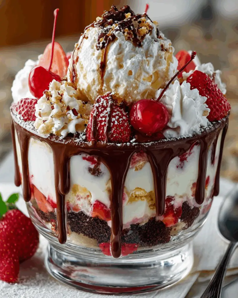 A delightful Strawberry Brownie Ice Cream Sundae Trifle that layers rich brownies, creamy vanilla ice cream, fresh strawberries, and whipped cream, topped with chocolate and strawberry syrup.