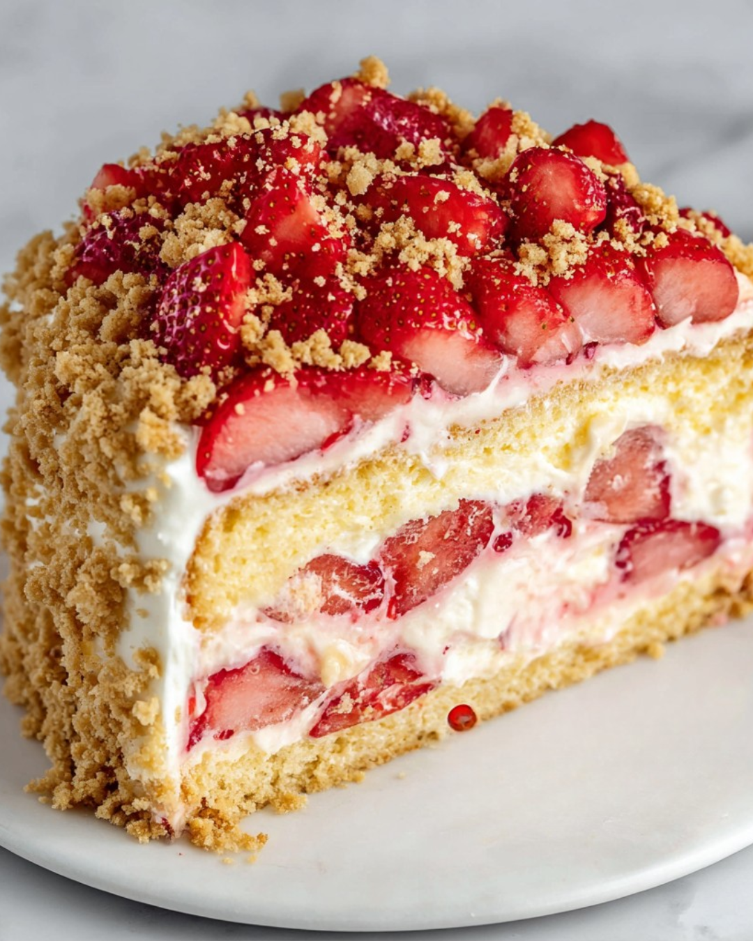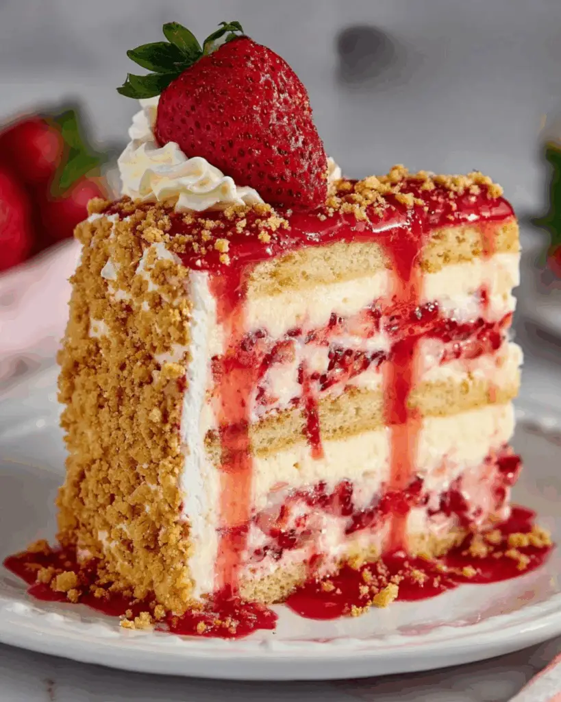 A delightful Strawberry Crunch Cake that combines the sweetness of strawberries with a crunchy graham cracker topping, perfect for any occasion.