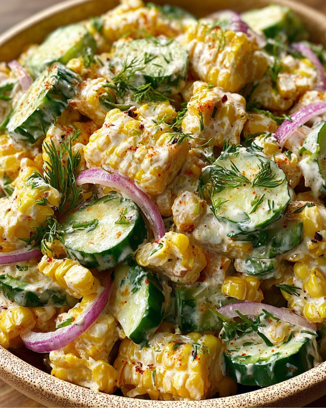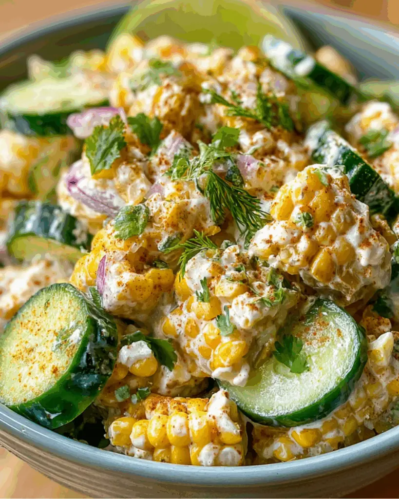 A refreshing and creamy salad featuring fresh corn, cucumbers, and a tangy dressing, perfect for summer gatherings.