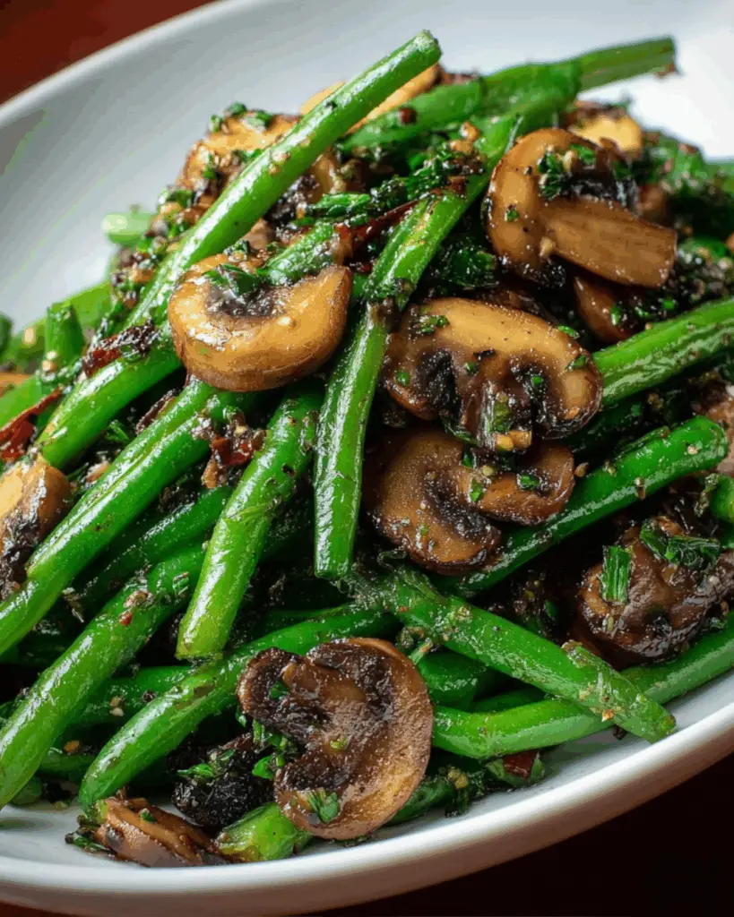 A delicious and healthy stir-fry recipe featuring fresh string beans and mushrooms, perfect for a quick meal.