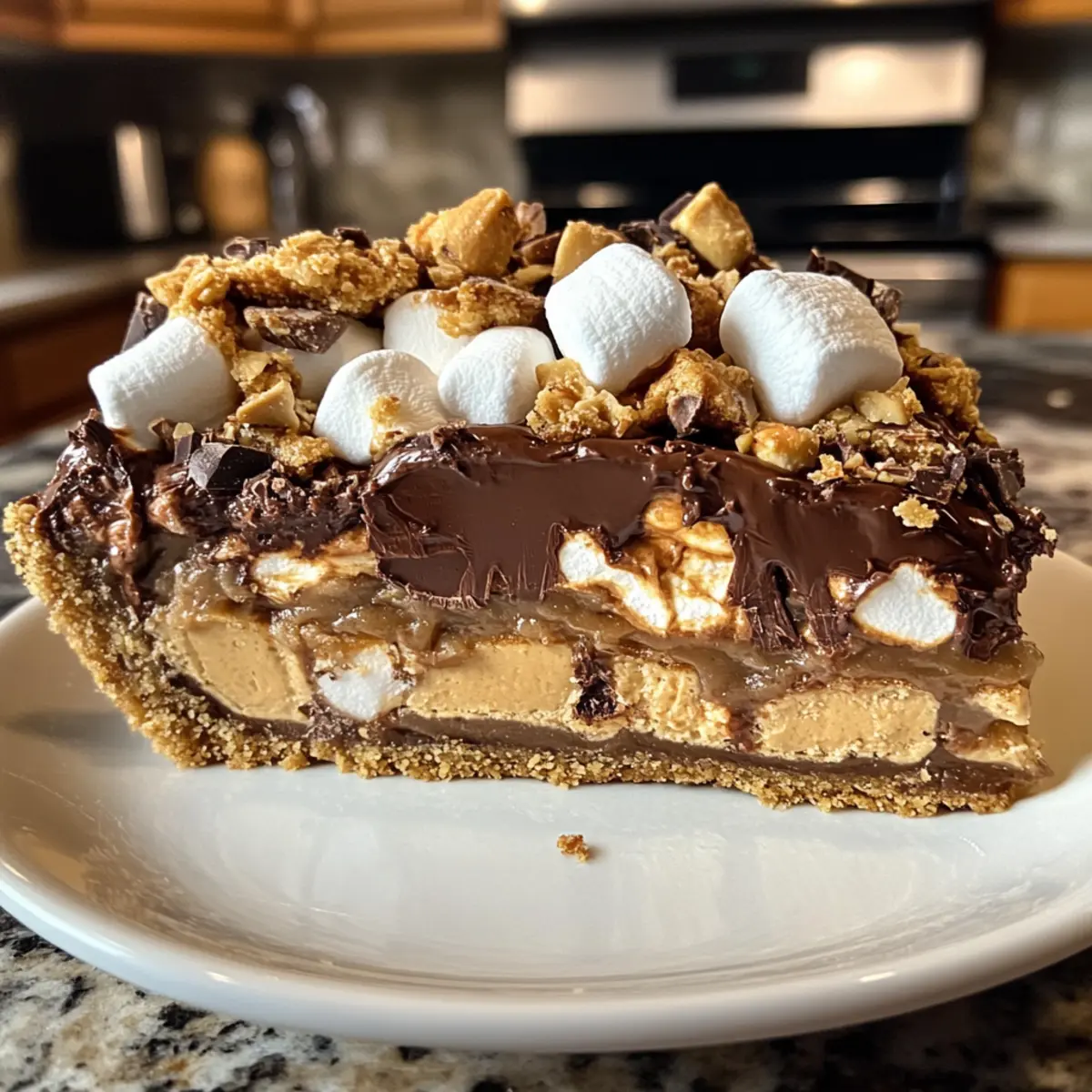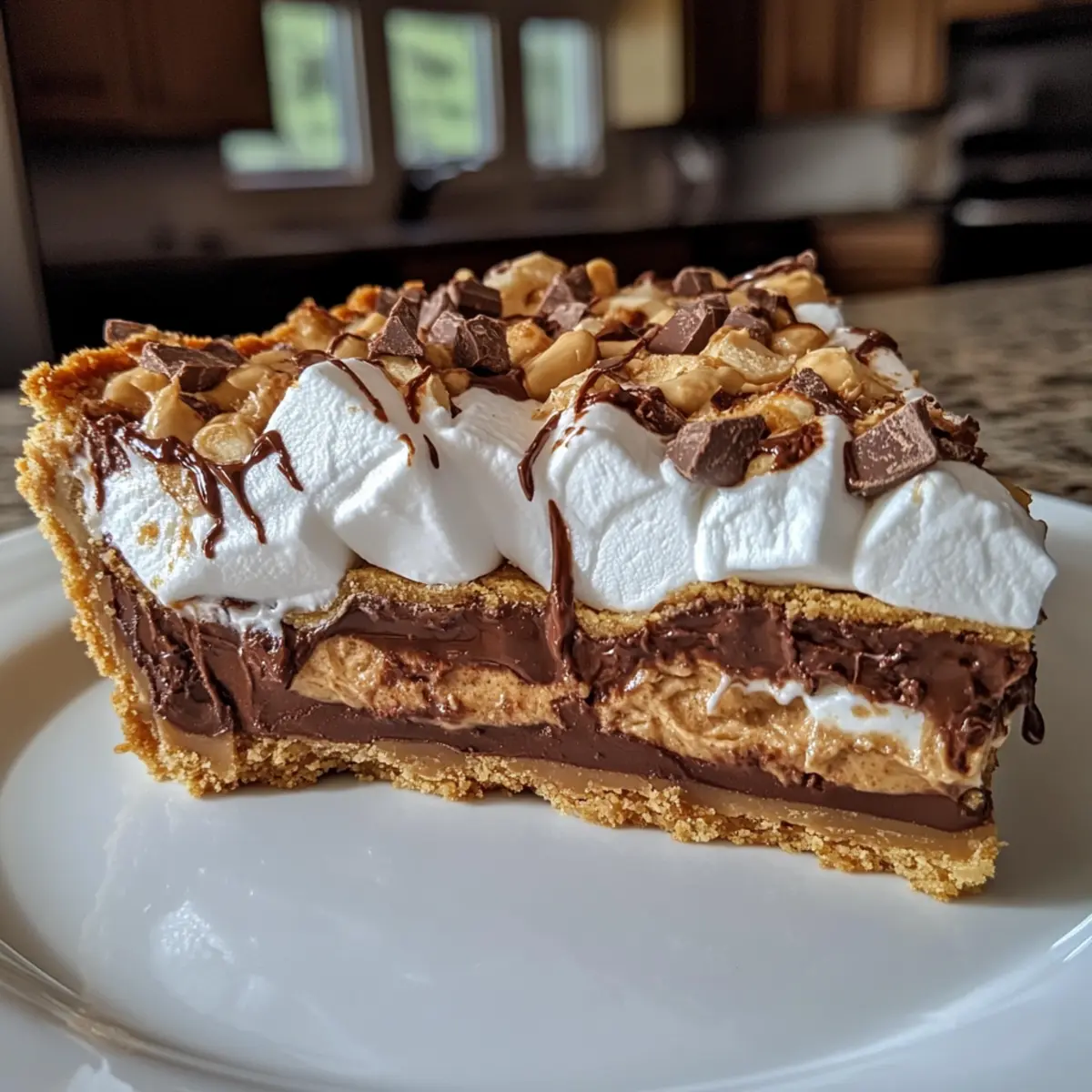 Melt 1 cup of creamy peanut butter slightly in the microwave, ensuring it’s warm but not hot. Pour this luscious layer into the crust, spreading it evenly across the bottom. Next, add mini Reese’s peanut butter cups and spoon in a spread of Nutella. Top it off with ½ cup of marshmallow cream, ½ cup of white chocolate chips, and sprinkle in broken pieces of mini Toblerone candies for an extra layer of flavor.