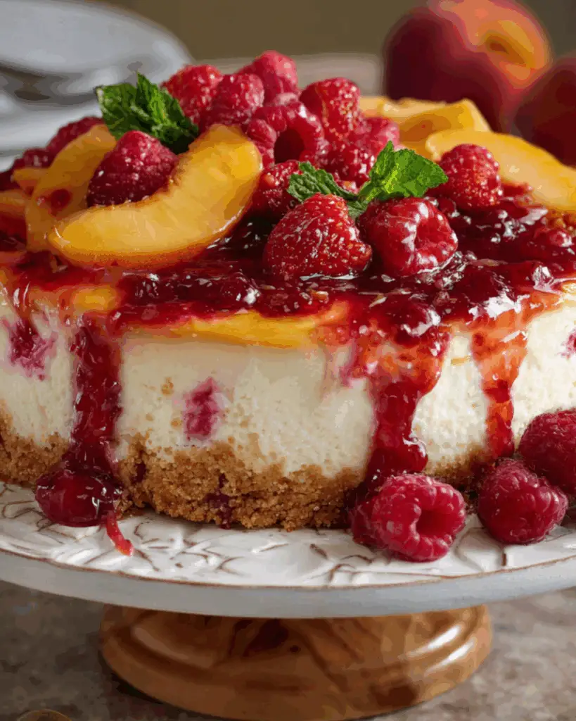 A delightful and creamy cheesecake featuring fresh peaches and raspberries, perfect for summer gatherings.