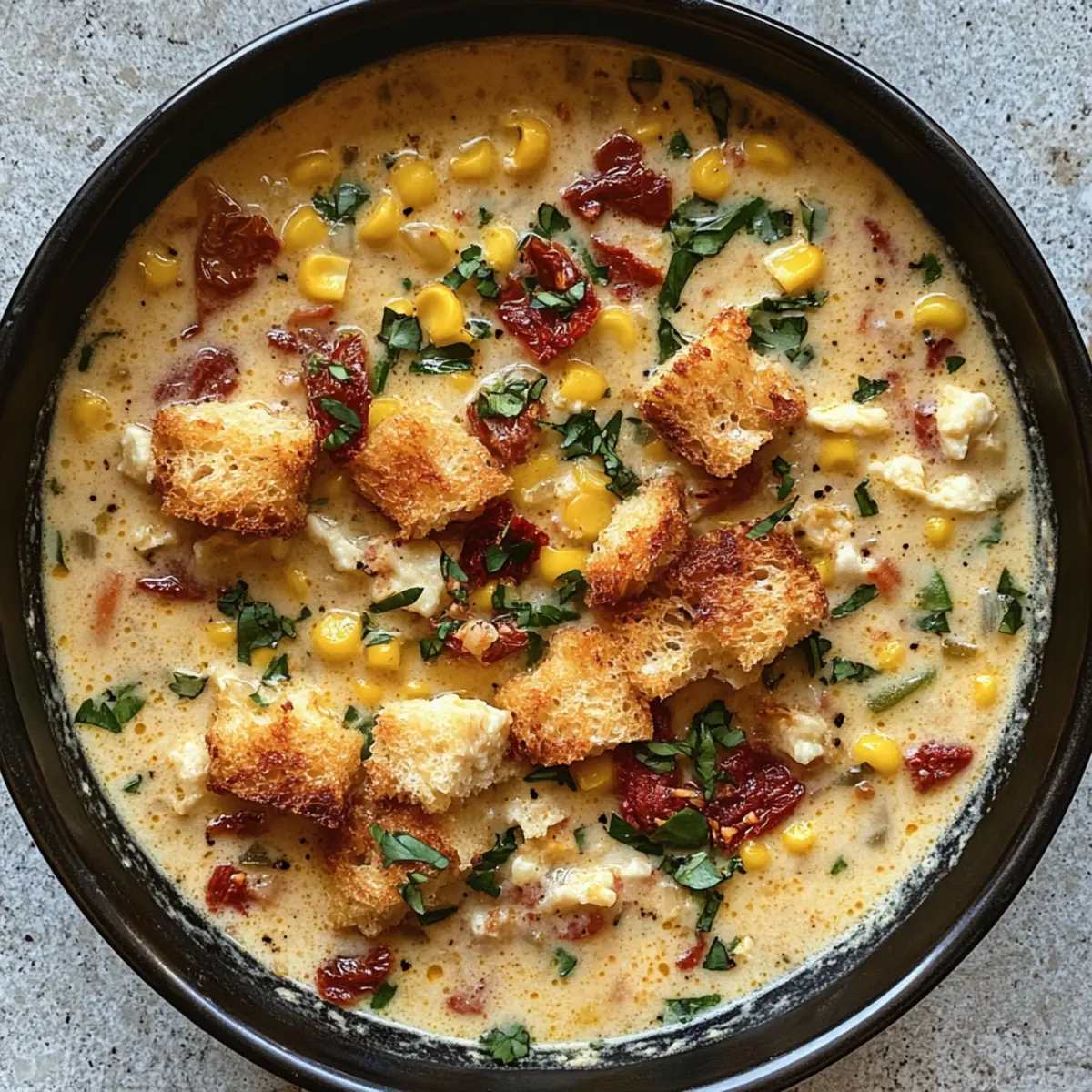 Ladle the warm, creamy chowder into bowls, allowing its vibrant colors to shine. Top each serving with a goat cheese crouton, extra sun-dried tomatoes, and a sprinkle of fresh corn. For an added touch, garnish with reserved chives, transforming your Sun Dried Tomato Corn Chowder into a visually stunning dish ready to impress!