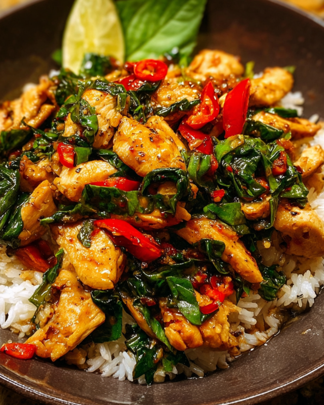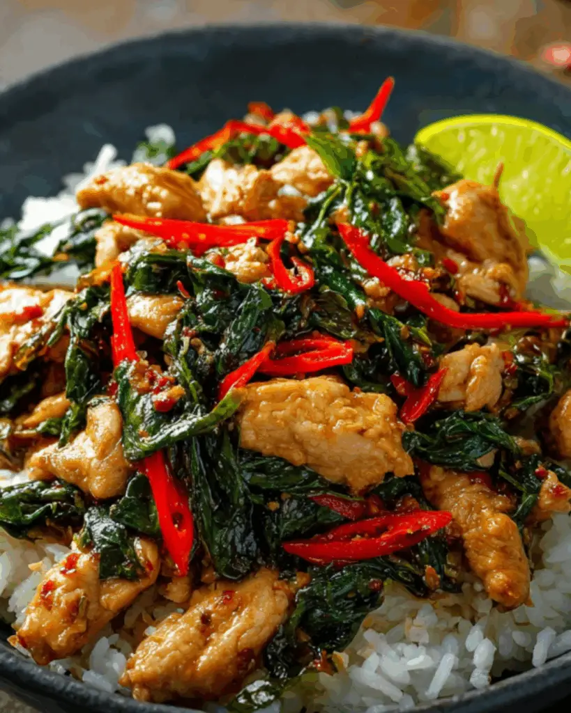 A flavorful and easy-to-make Thai Basil Chicken Stir Fry that combines tender chicken with fresh vegetables and aromatic Thai basil.