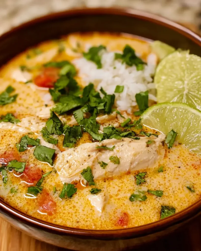 A flavorful and creamy Thai Chicken Soup made with coconut milk, chicken, and fresh vegetables.