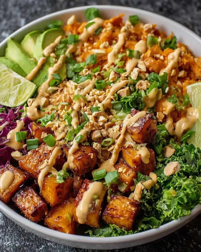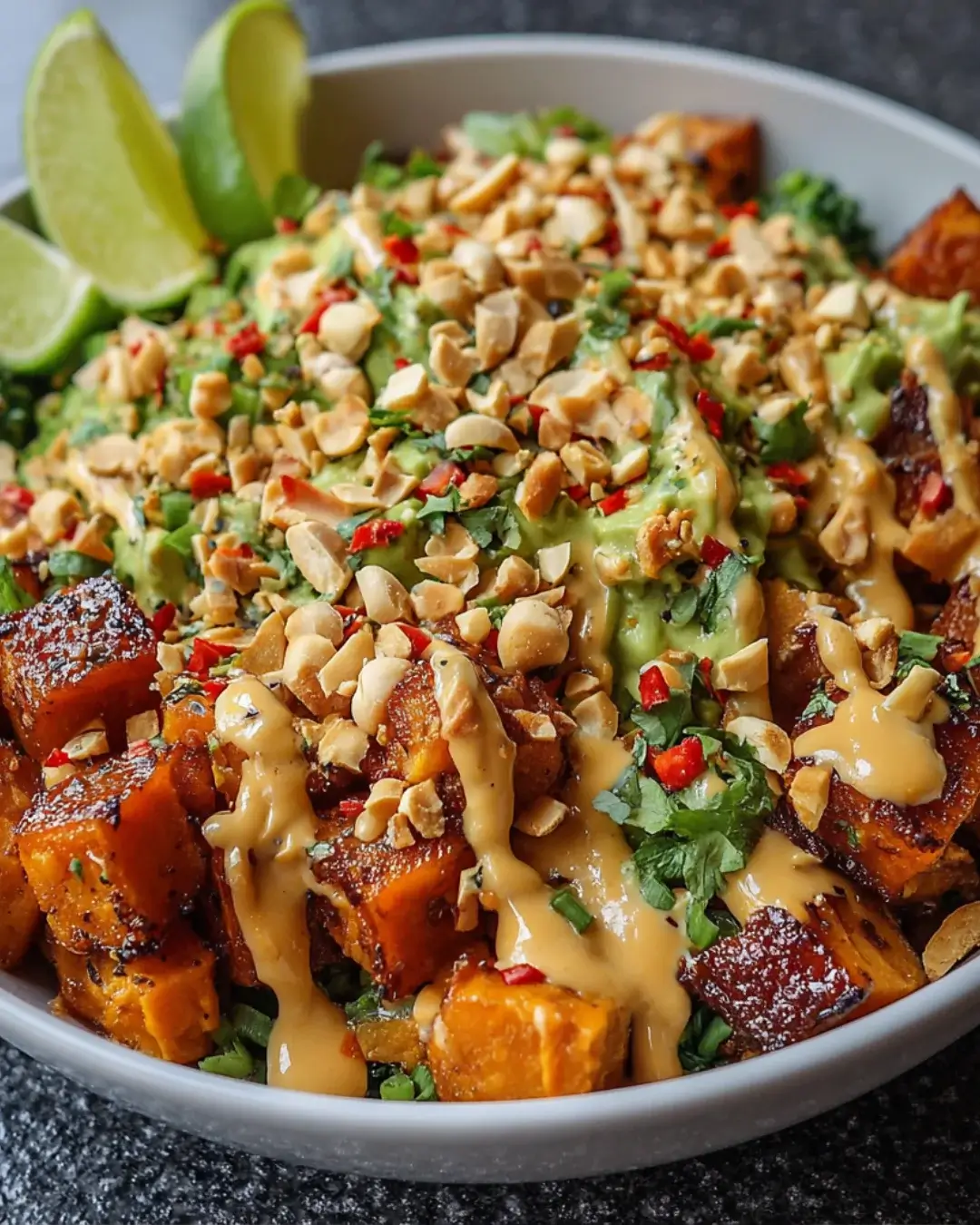 A delicious and nutritious Thai Peanut Sweet Potato Buddha Bowl featuring roasted sweet potatoes, quinoa, and a creamy peanut sauce.