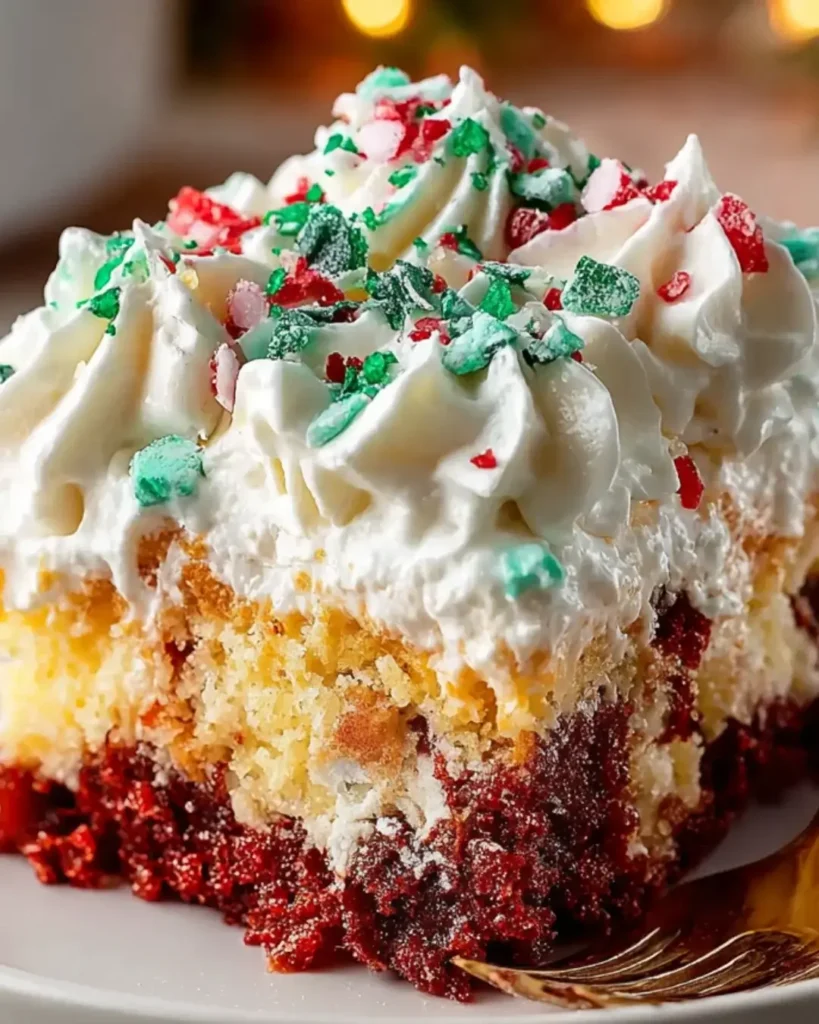 A festive and delicious poke cake perfect for Christmas celebrations, featuring a moist cake soaked in fruity gelatin and topped with whipped cream and crushed candy canes.