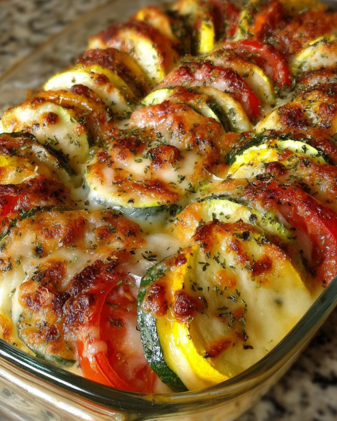 A delicious and healthy casserole made with layers of fresh vegetables including tomatoes, zucchini, summer squash, and potatoes, topped with melted cheese.