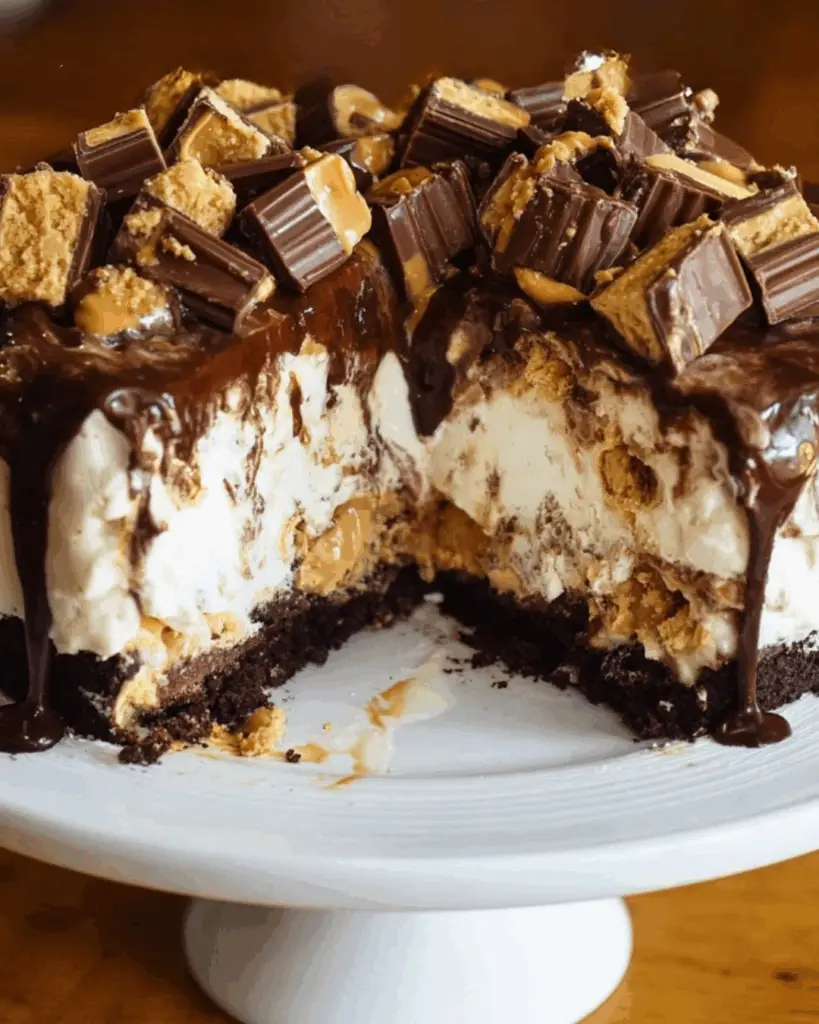 A delicious layered dessert combining chocolate cookie crust, creamy peanut butter ice cream, and whipped cream topped with fudge sauce and mini peanut butter cups.