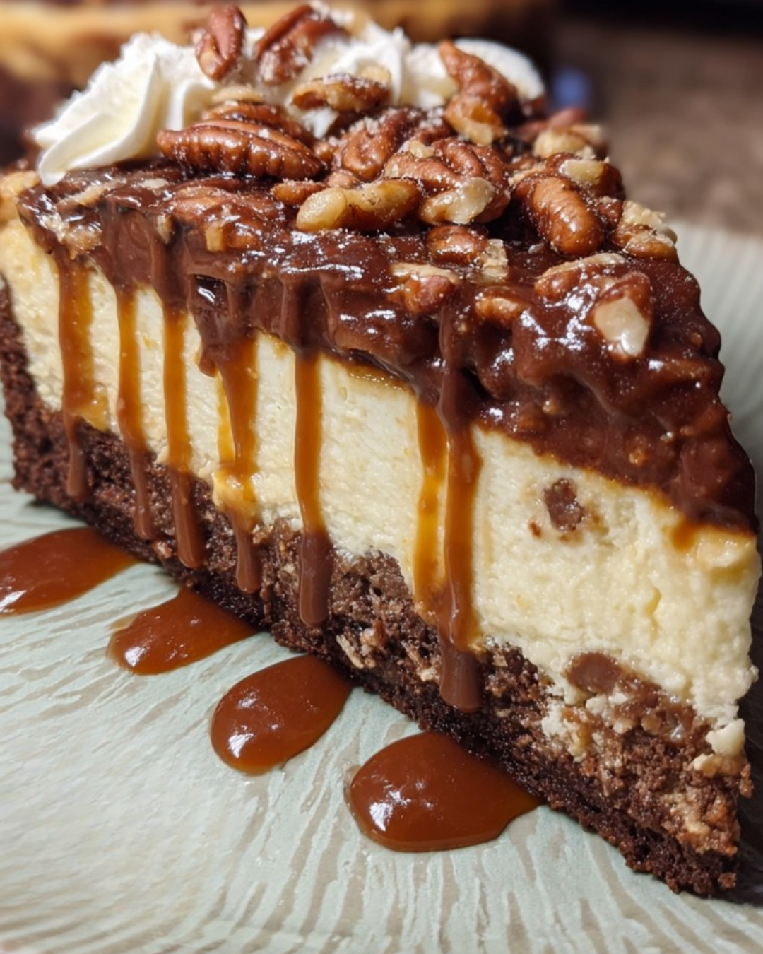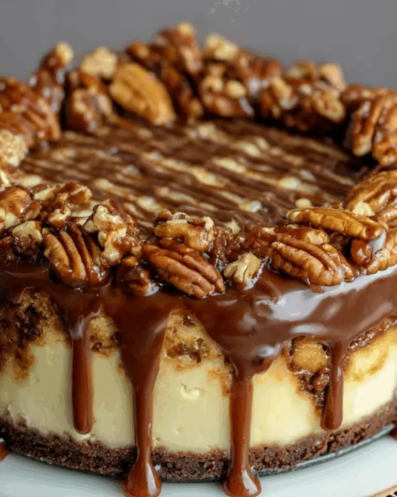 A rich and creamy Turtle Fudge Cheesecake topped with caramel and pecans, perfect for chocolate lovers.