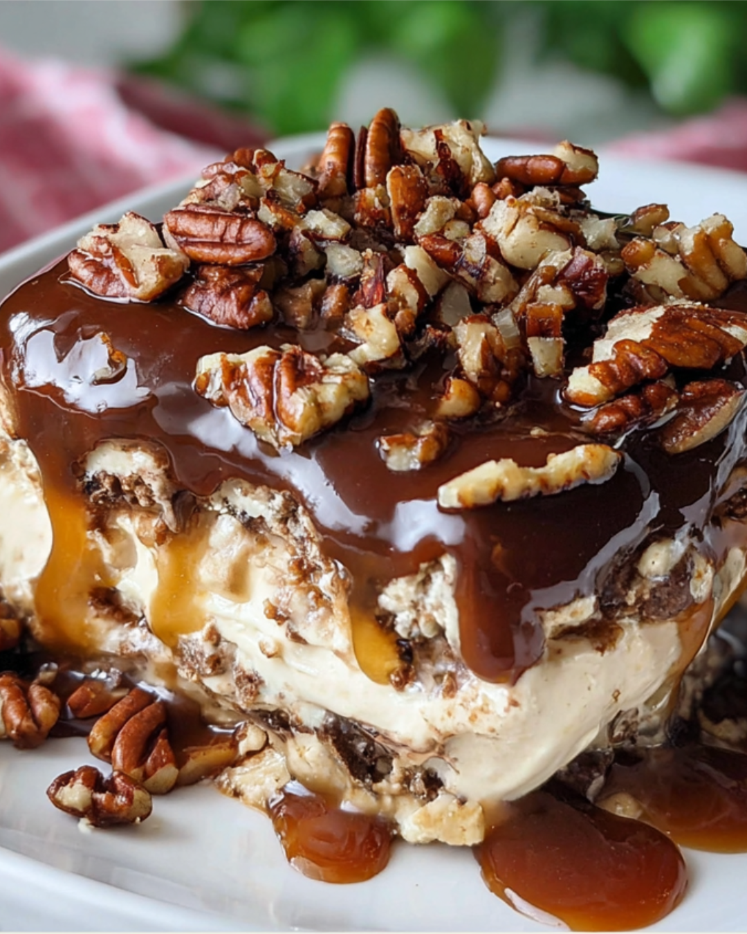 Turtle Lush is a delightful no-bake dessert that combines layers of creamy goodness with a crunchy graham cracker crust, topped with caramel, chocolate, and pecans.