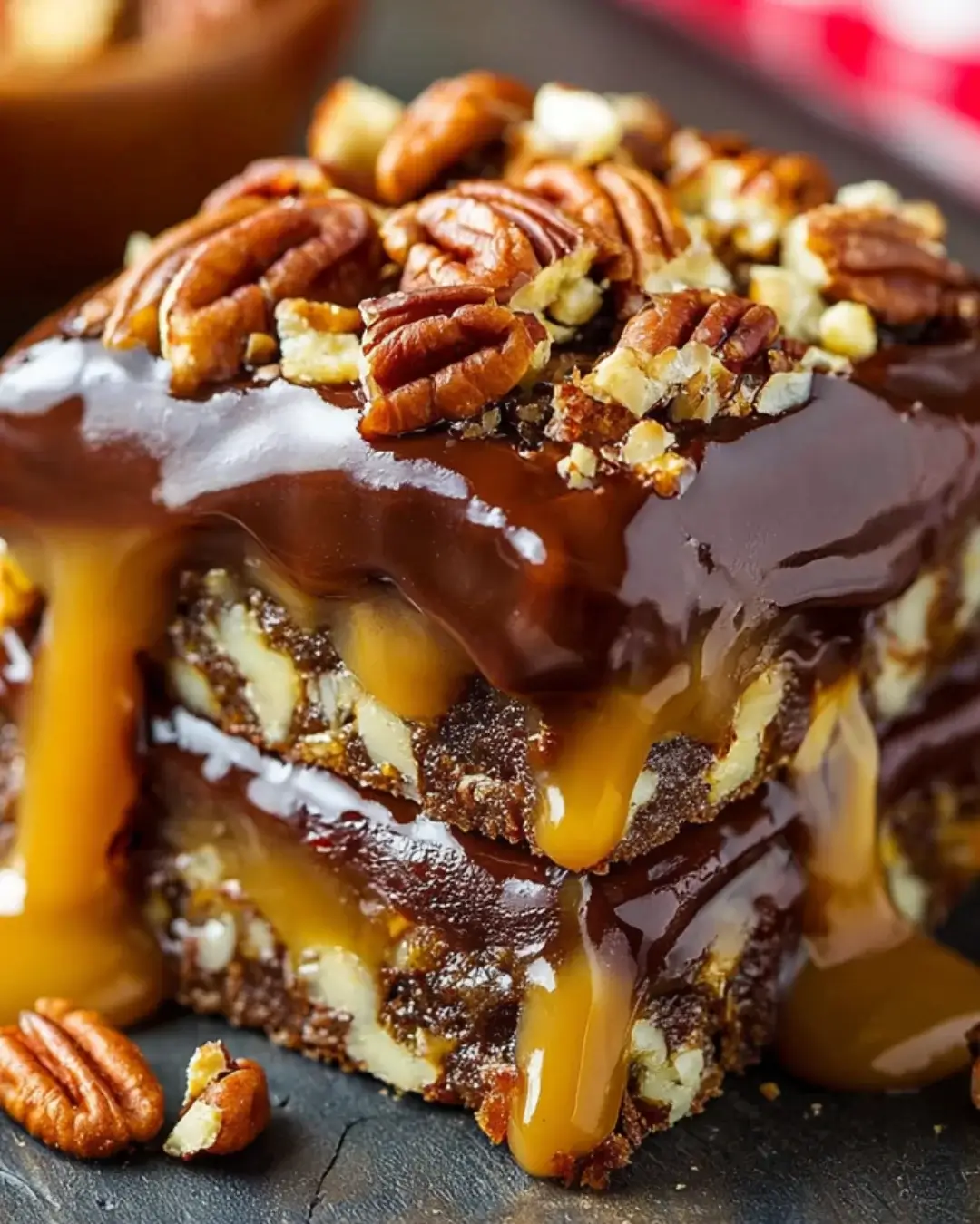 Now for the finishing touches! Drizzle the caramel sauce generously over the fudge frosting. Then, sprinkle the chopped pecans on top for that perfect crunch. Allow the cake to cool completely before slicing into it. Your Turtle Texas Sheet Cake is ready to impress!