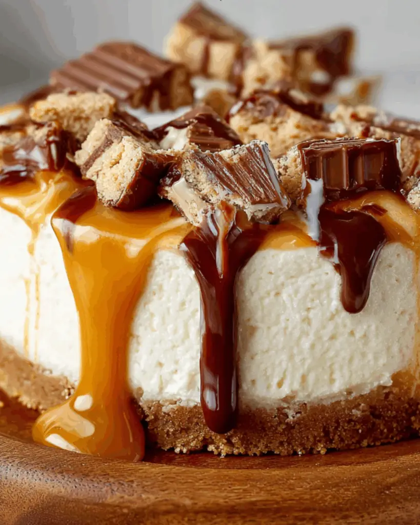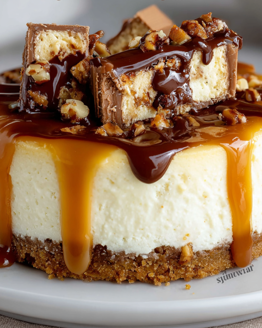 A delicious Twix Cheesecake that combines the flavors of creamy cheesecake with the delightful crunch of Twix bars.