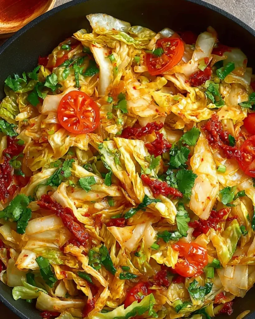 Remove the skillet from heat and sprinkle chopped fresh cilantro on top. This adds a burst of color and freshness. Serve your Vietnamese Stir-fried Cabbage with Tomato hot, and enjoy the delightful flavors!