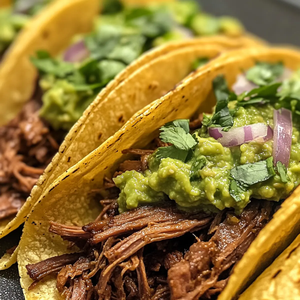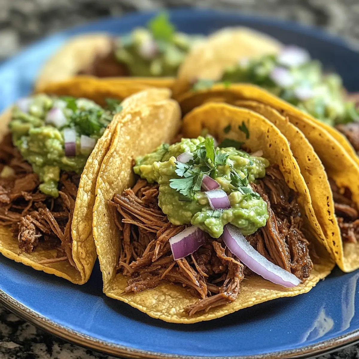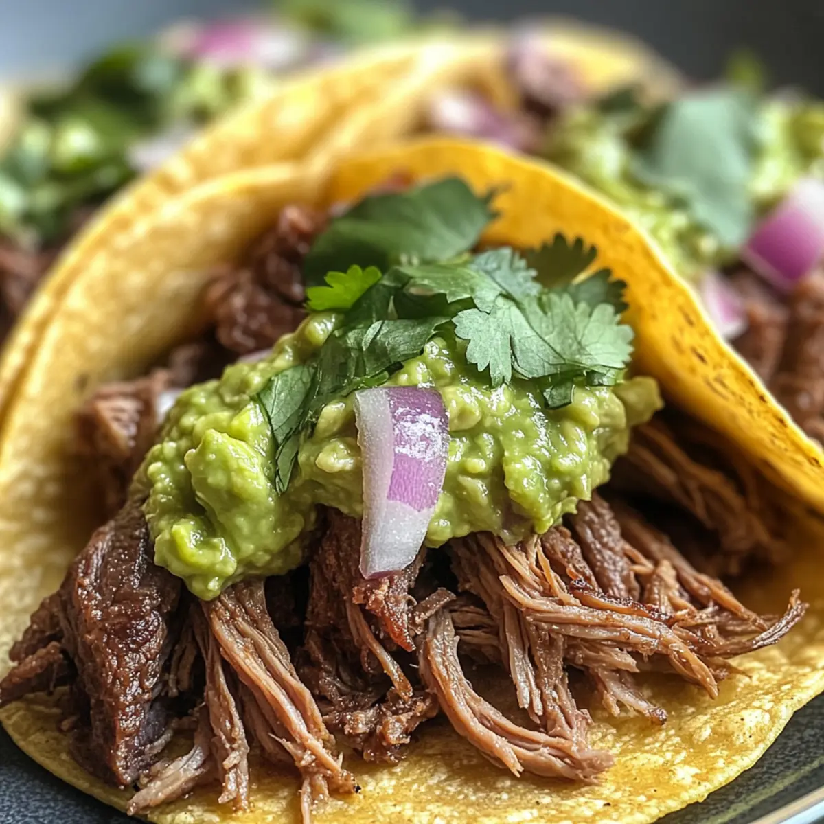 - Assemble your tacos with the creamy guacamole, crispy shredded meat, and optional toppings.