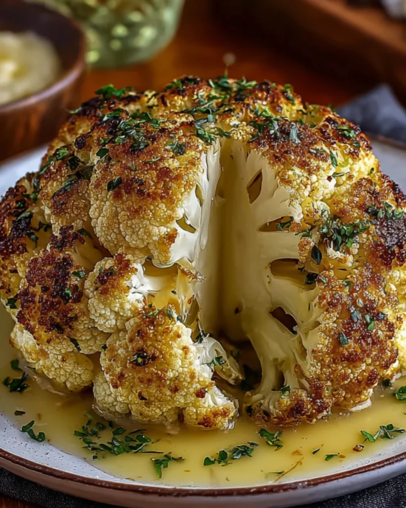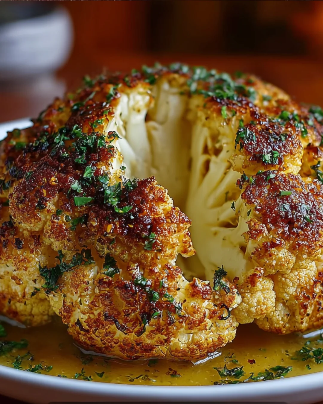 A delicious and visually stunning whole roasted cauliflower dish drizzled with a rich butter sauce, perfect for elevating any dinner.