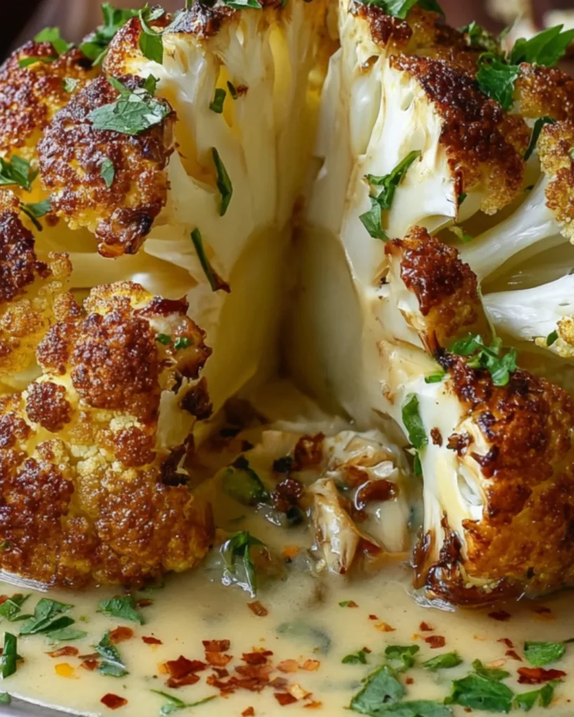 Once the cauliflower is done roasting, remove it from the oven and drizzle the butter sauce generously over the top. If you like, sprinkle some fresh parsley for a pop of color and freshness. Serve hot, and watch as everyone digs in!