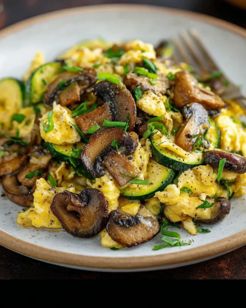A quick and healthy zucchini and mushroom scramble that is perfect for breakfast or a light meal.